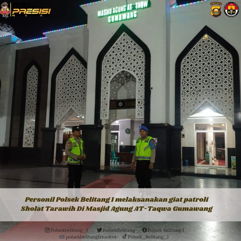 Belpost OKU Timur, 18 Maret 2025 – Dalam upaya menjaga keamanan dan kenyamanan umat Muslim yang menjalankan ibadah di bulan suci Ramadan, personel Polsek Belitang I melaksanakan patroli serta pengamanan salat Tarawih di Masjid Agung At-Takwa, Gumawang, pada Selasa malam (18/3).