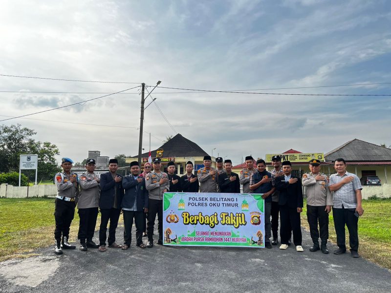 Belitang – Momentum bulan suci Ramadhan 1447 Hijriah dimanfaatkan jajaran Polsek Belitang I Polres OKU Timur untuk mempererat kedekatan dengan masyarakat melalui aksi kemanusiaan. Pada Jumat sore, 06 Maret 2026, suasana di depan Mapolsek Belitang I tampak hangat dengan adanya kegiatan pembagian paket takjil gratis kepada para pengguna jalan. Kegiatan yang dipimpin langsung oleh Kapolsek Belitang I AKP Johan Syafri S.E. ini melibatkan Wakapolsek, para Kanit, serta personel Polsek Belitang I. Menariknya, aksi sosial kali ini juga menggandeng organisasi kemahasiswaan dari STIT Nurussalam sebagai wujud kolaborasi aktif kepolisian dengan elemen pemuda di wilayah Kecamatan Belitang I.
