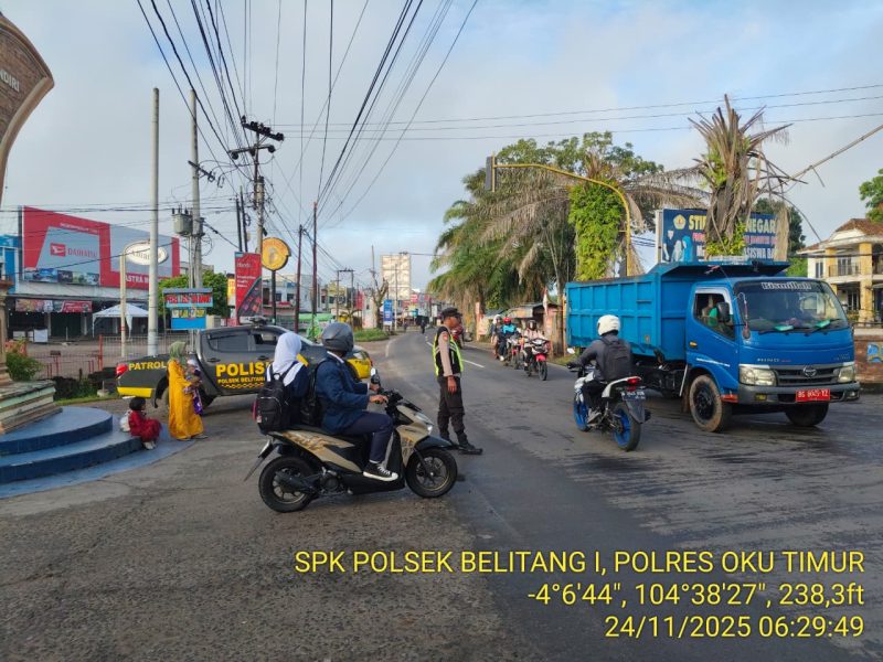 BELITANG, OKU TIMUR – Mengawali pekan kerja, Polsek Belitang I Polres OKU Timur menggelar kegiatan Strong Point Pengaturan Lalu Lintas di titik-titik rawan kemacetan dan kecelakaan. Pada Senin pagi, 24 November 2025, sejak pukul 06.30 WIB hingga selesai, personel Polsek fokus mengamankan arus kendaraan di Jalan Raya Belitang Simpang 4 Tugu KTM.