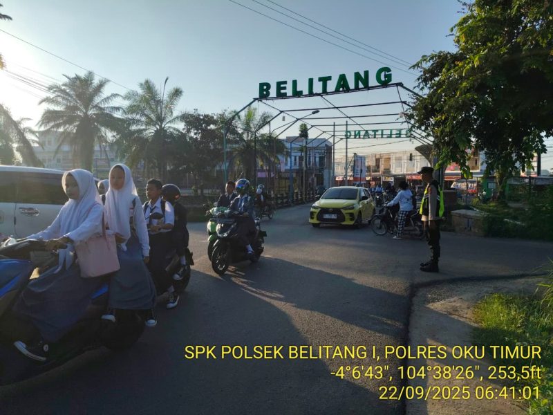 OKU Timur – Dalam rangka menciptakan situasi lalu lintas yang aman dan lancar pada jam sibuk pagi, Personel Polsek Belitang I Polres OKU Timur melaksanakan kegiatan Pengaturan Strong Point pada Senin (22/9/2025) sejak pukul 06.30 WIB hingga selesai.