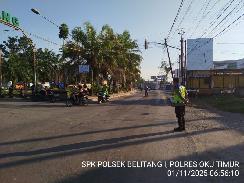 OKU Timur – Dalam rangka menjaga kelancaran arus lalu lintas dan menciptakan keamanan serta ketertiban masyarakat di pagi hari, Personel Polsek Belitang I melaksanakan kegiatan pengaturan lalu lintas atau strong point di Simpang Tugu KTM, Kecamatan Belitang, pada Sabtu, 1 November 2025, mulai pukul 06.30 WIB hingga selesai.